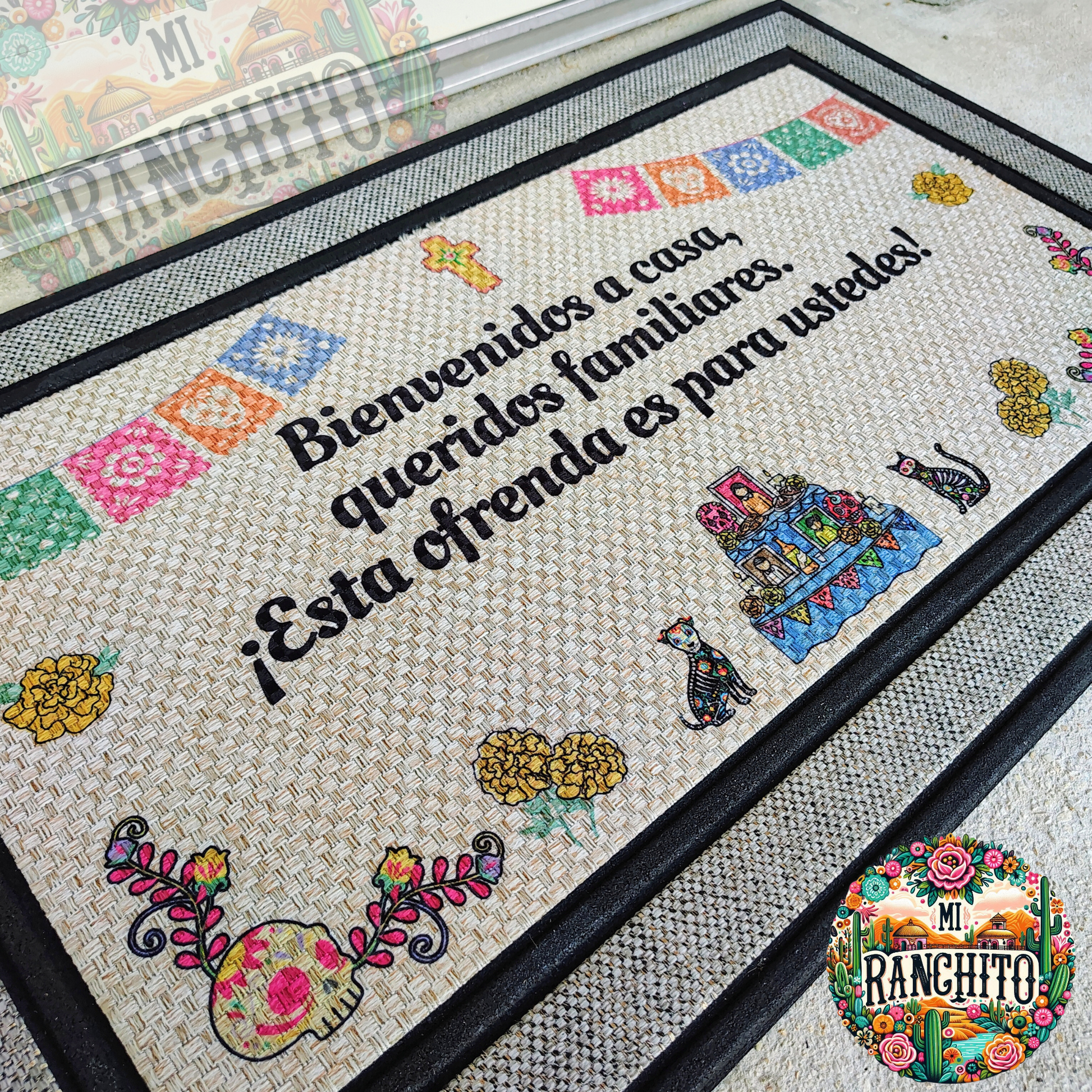 Item details- 18 in. x 30 in. Rubber rectangle polyethylene fabric door mat. Perfect for indoor or outdoor. Slip resistant. Durable weather-resistant tapetito, aguanta seasonal changes for outdoor use all year long! No tienen que preocuparse si se moja o si está en el sol.